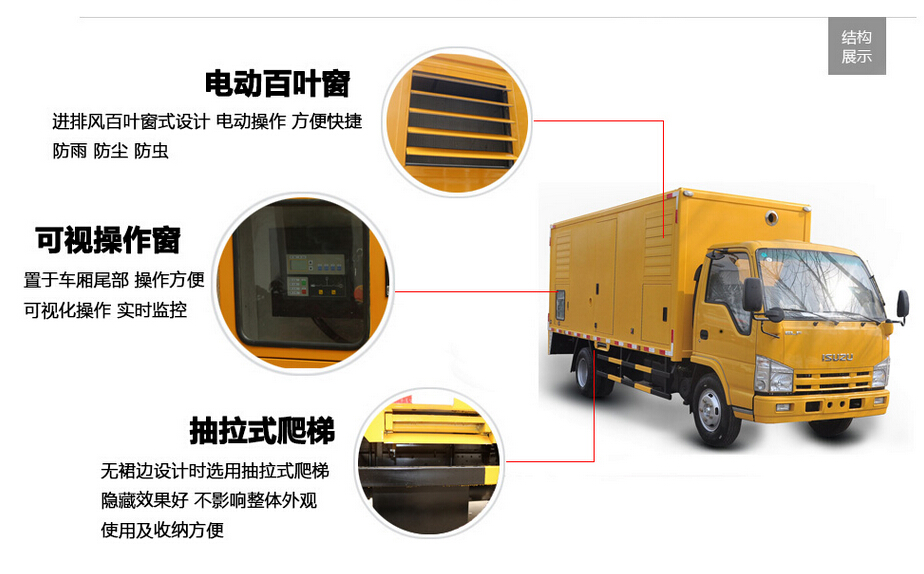发电机组冷却水箱朝向车头前方便于散热,车量前段设立独立的吸音排风仓,装置全铝合金百页窗。