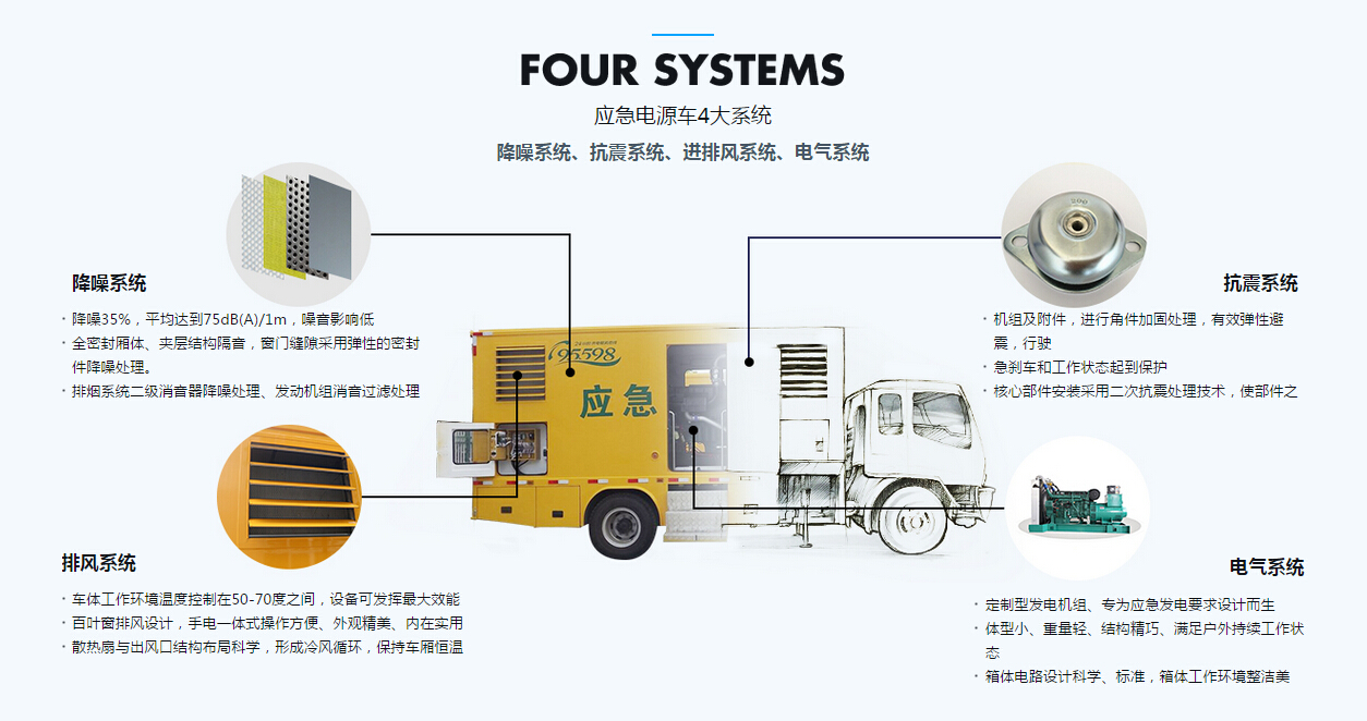 移动电源车由二类汽车底盘,静音厢体,柴油发动机,发电机组,控制系统,内外照明装置,输配电装置,电缆卷盘,电源输入,输出接口,液压支腿等构成。